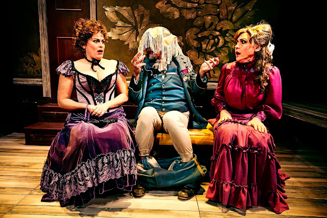 Der er generelt en eller anden mislyd i forestillingen der gør, at den, trods en ihærdig indsats fra hele holdet på scenen, bliver usjov. Det usjove topper, når fx sætningen ’andet linned’ i en snak om vasketøj bliver til ’Anne Linnet’, eller når den franske doktor, der ellers hele forestillingen har kæmpet for at få fat i den unge Laura Pagh, til slut pludselig og på et splitsekund indser, at han er homoseksuel. Det er ikke morsomt og det går tydeligt efter den laveste fællesnævner. Og det er nok min største anke mod hele ’wild west’-setuppet. Det går i mod den Shakespearske sprogtone og Nils Brunses danske oversættelse.